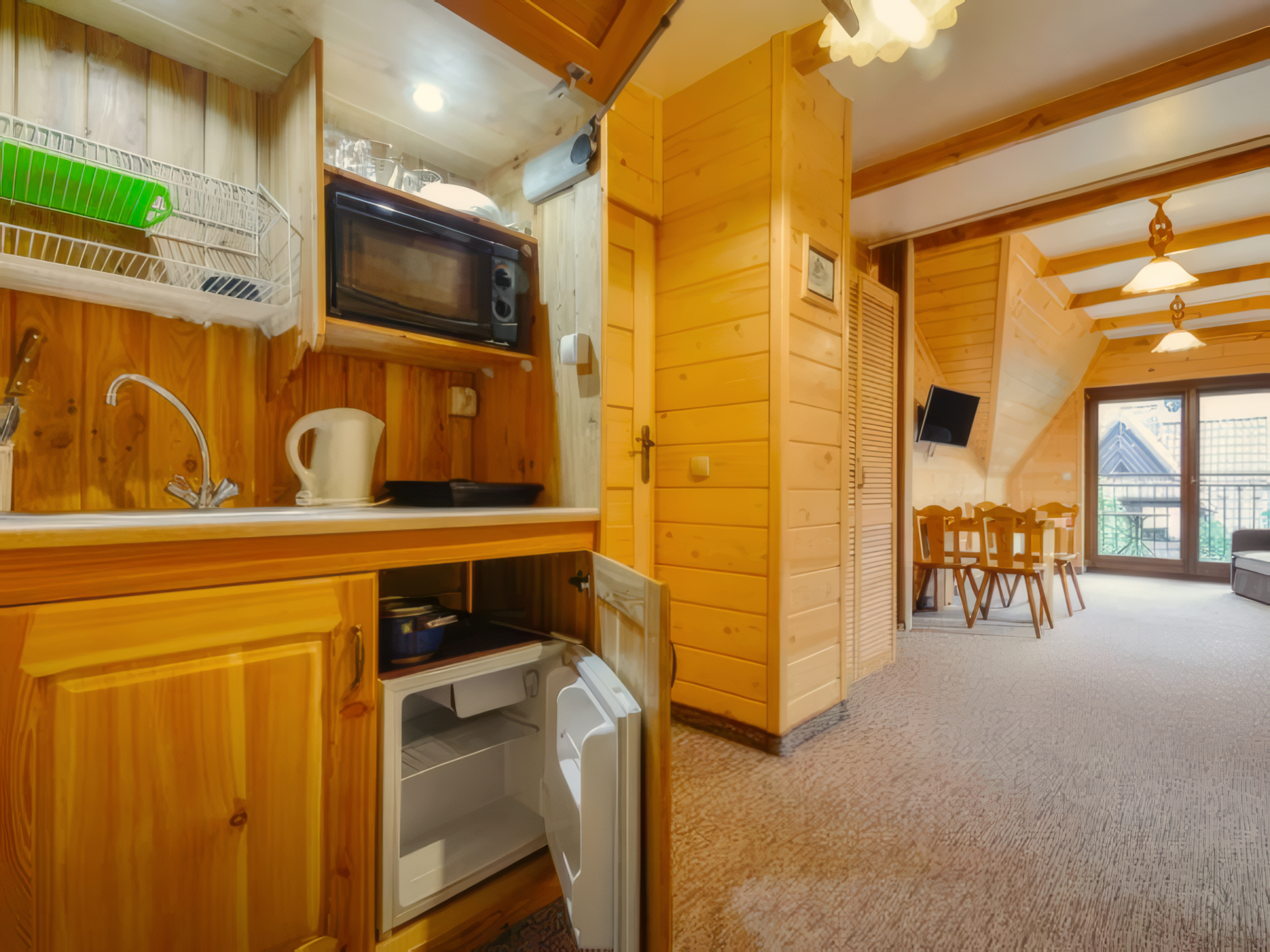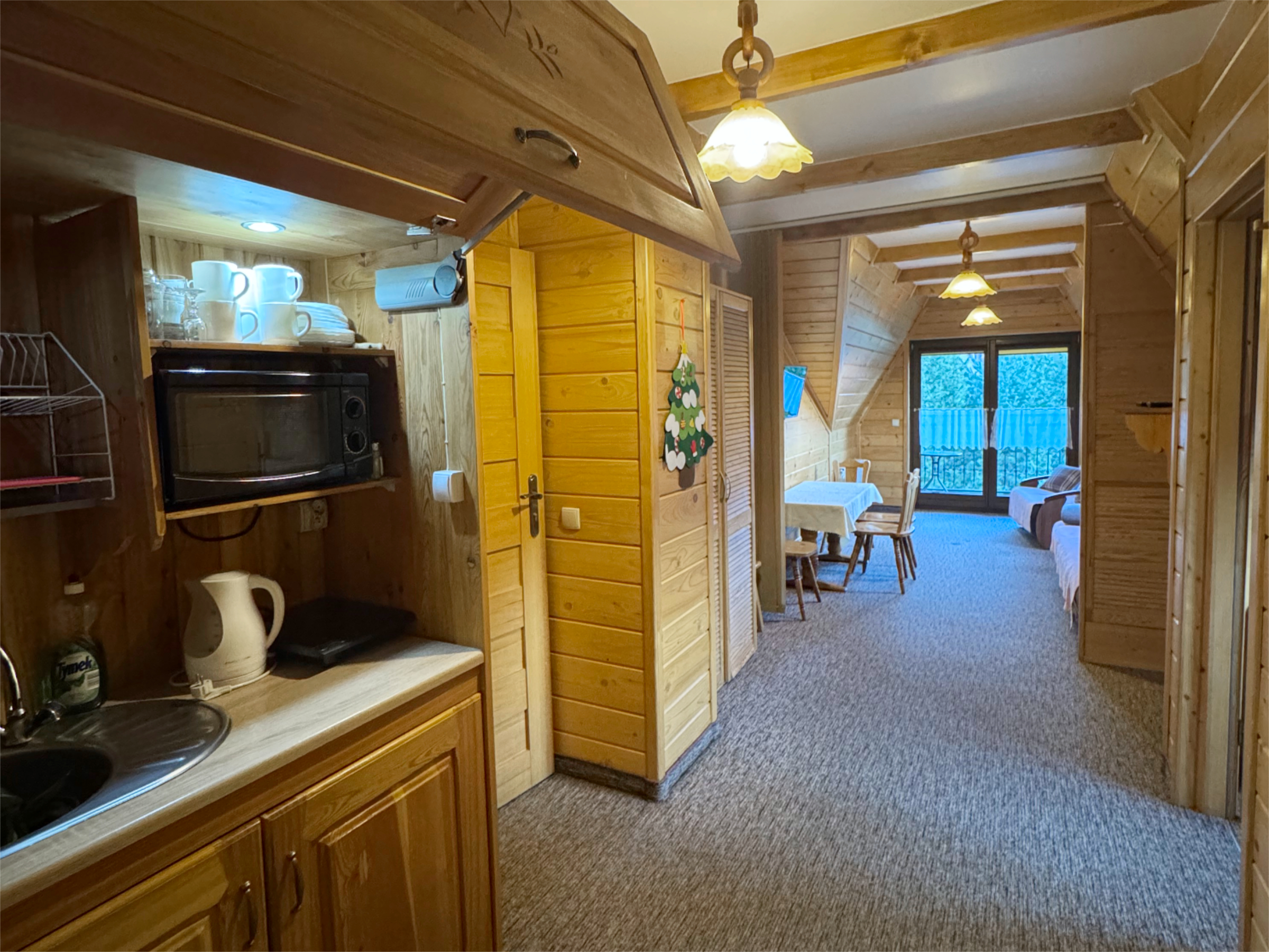 Apartament dla 4 osób na drugim piętrze. Wyposażenie: łoże małżeńskie w oddzielnej sypialni, rozkładana kanapa, rozkładany fotel, dwa telewizory, aneks kuchenny, łazienka. Osobny balkon z widokiem na góry.