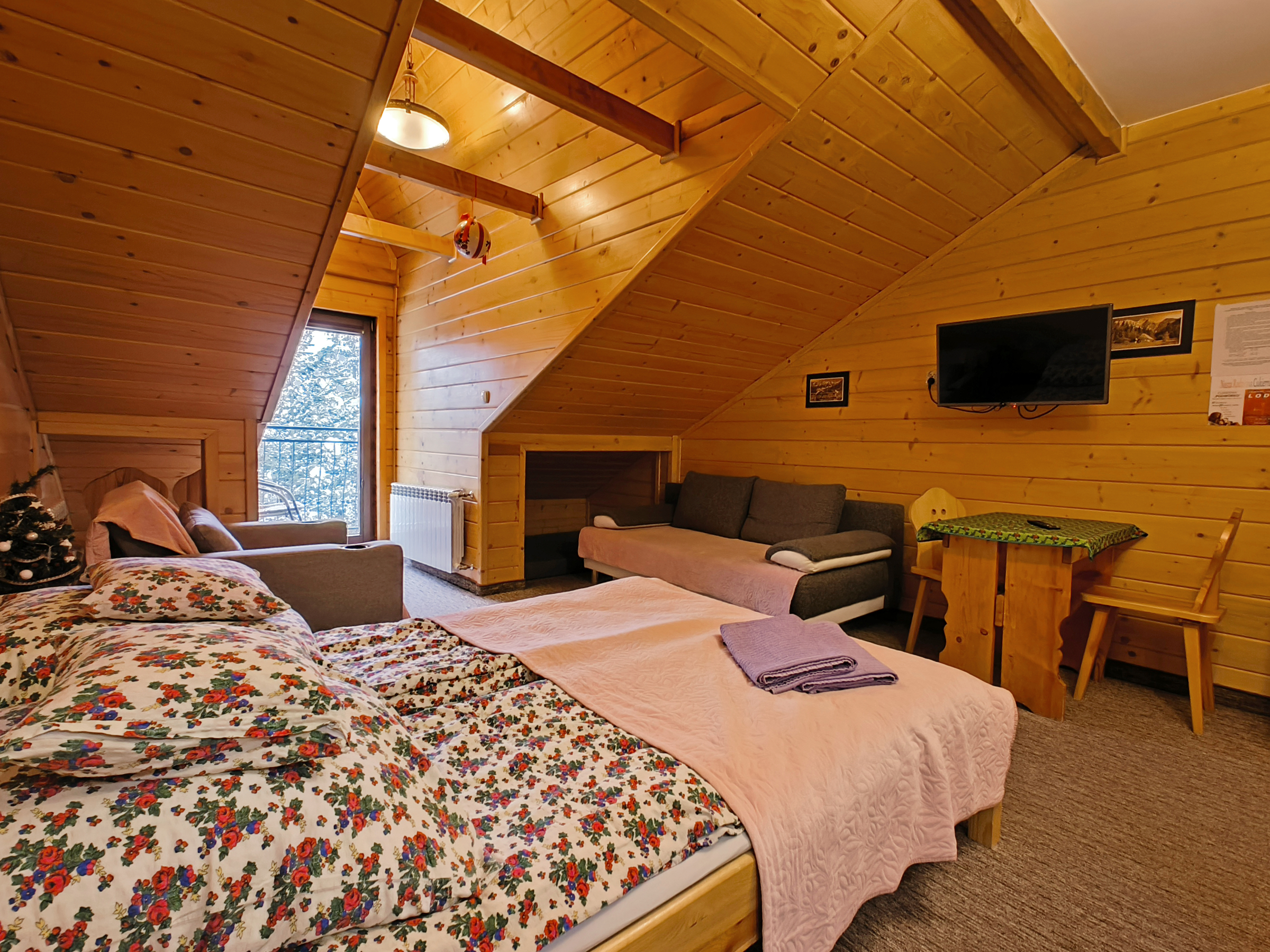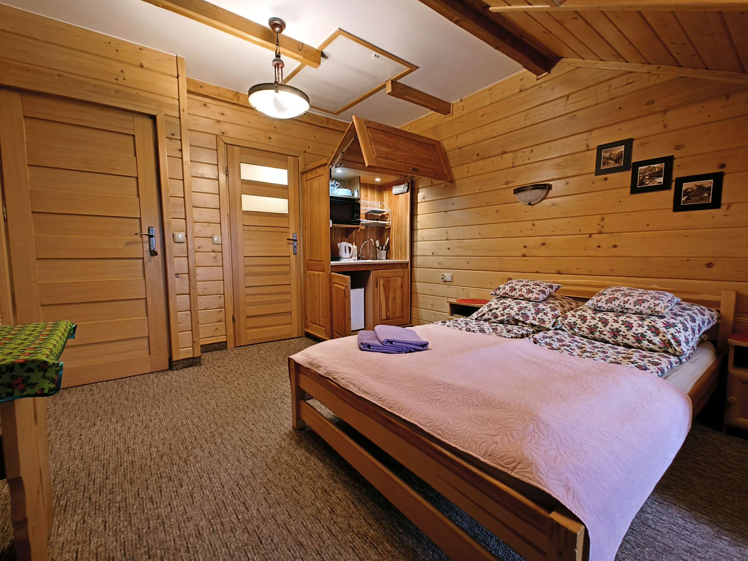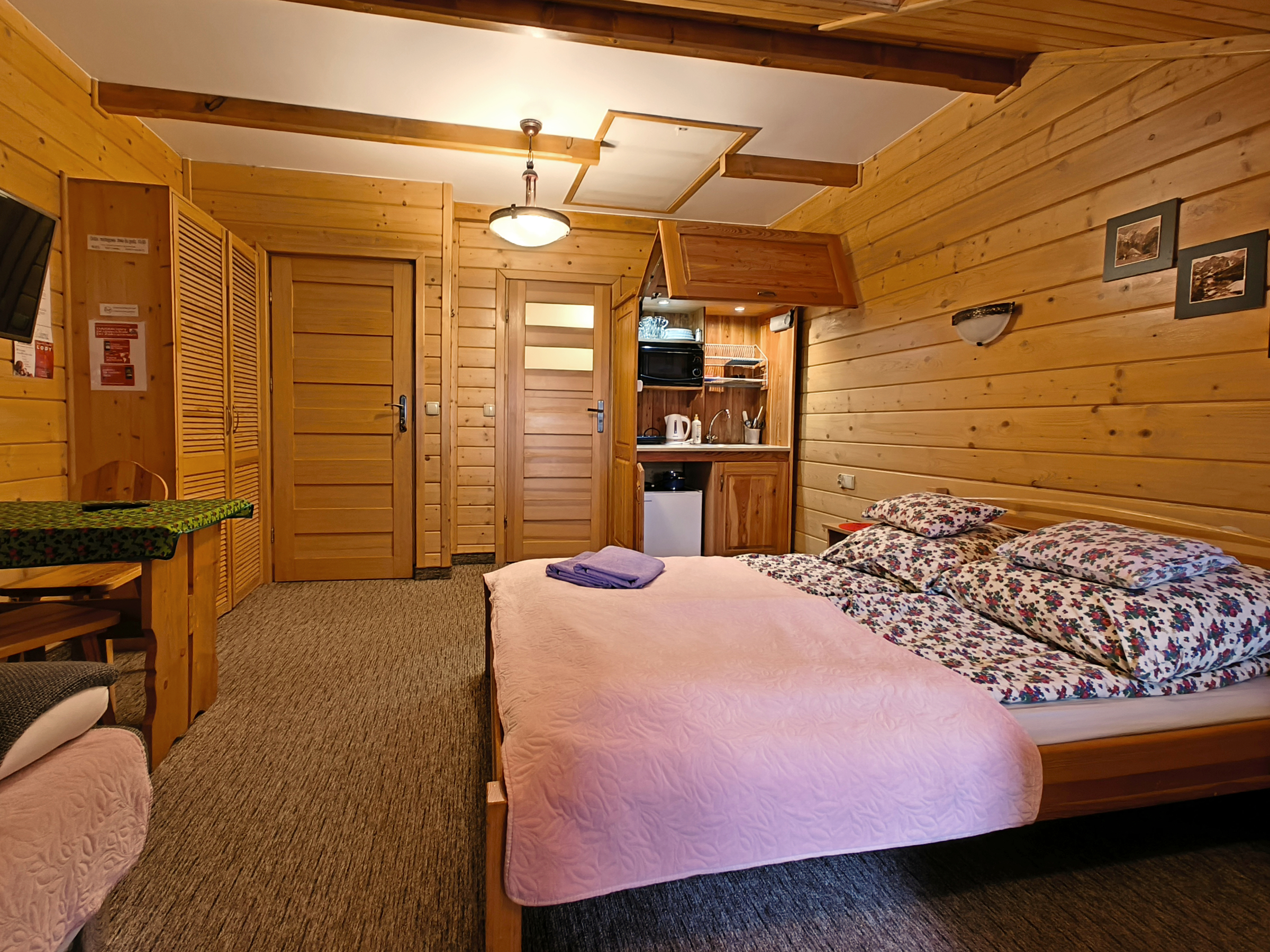 Pokój dla 2 – 4 osób na drugim piętrze, wykończony drewnem w góralskim stylu. Wyposażenie: łoże małżeńskie, rozkładana kanapa, telewizor, aneks kuchenny, łazienka, WiFi. Osobny balkon z widokiem na góry.