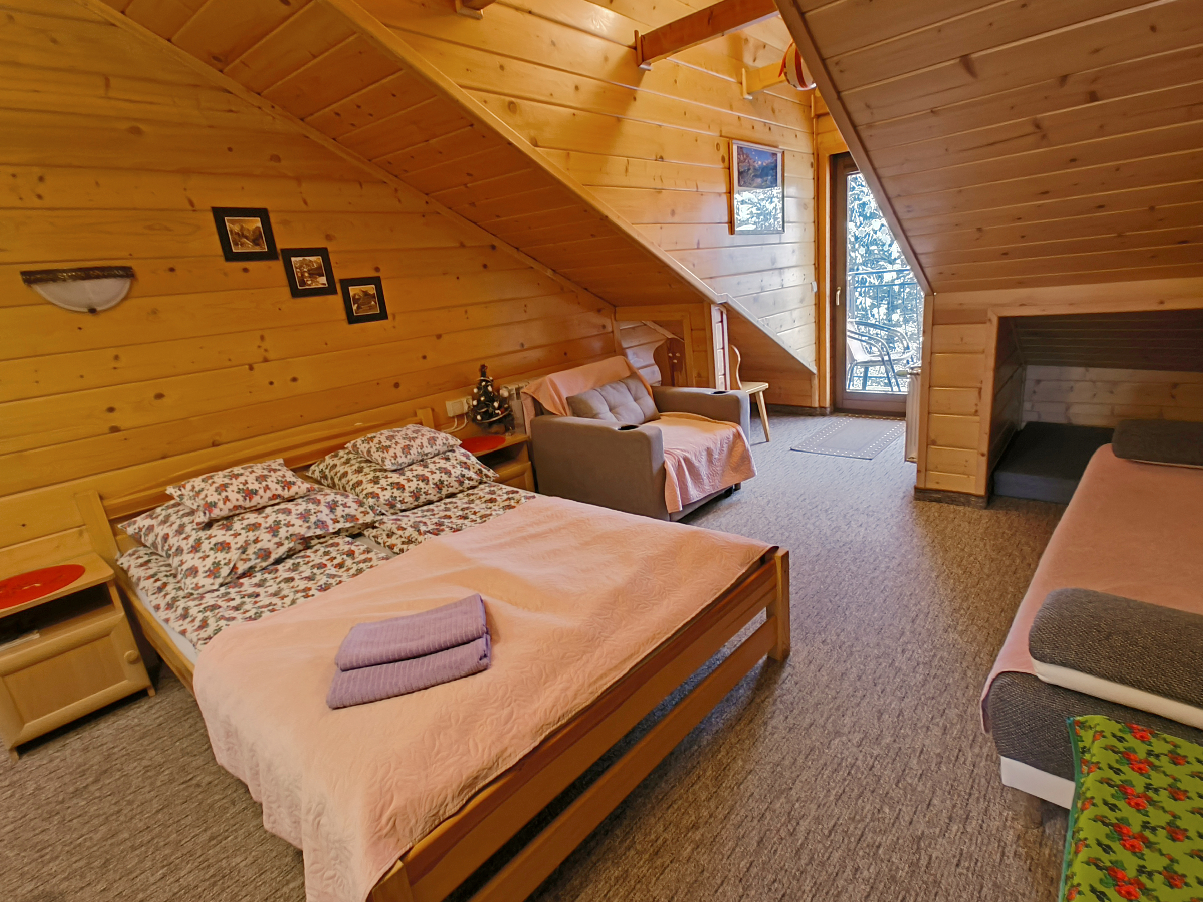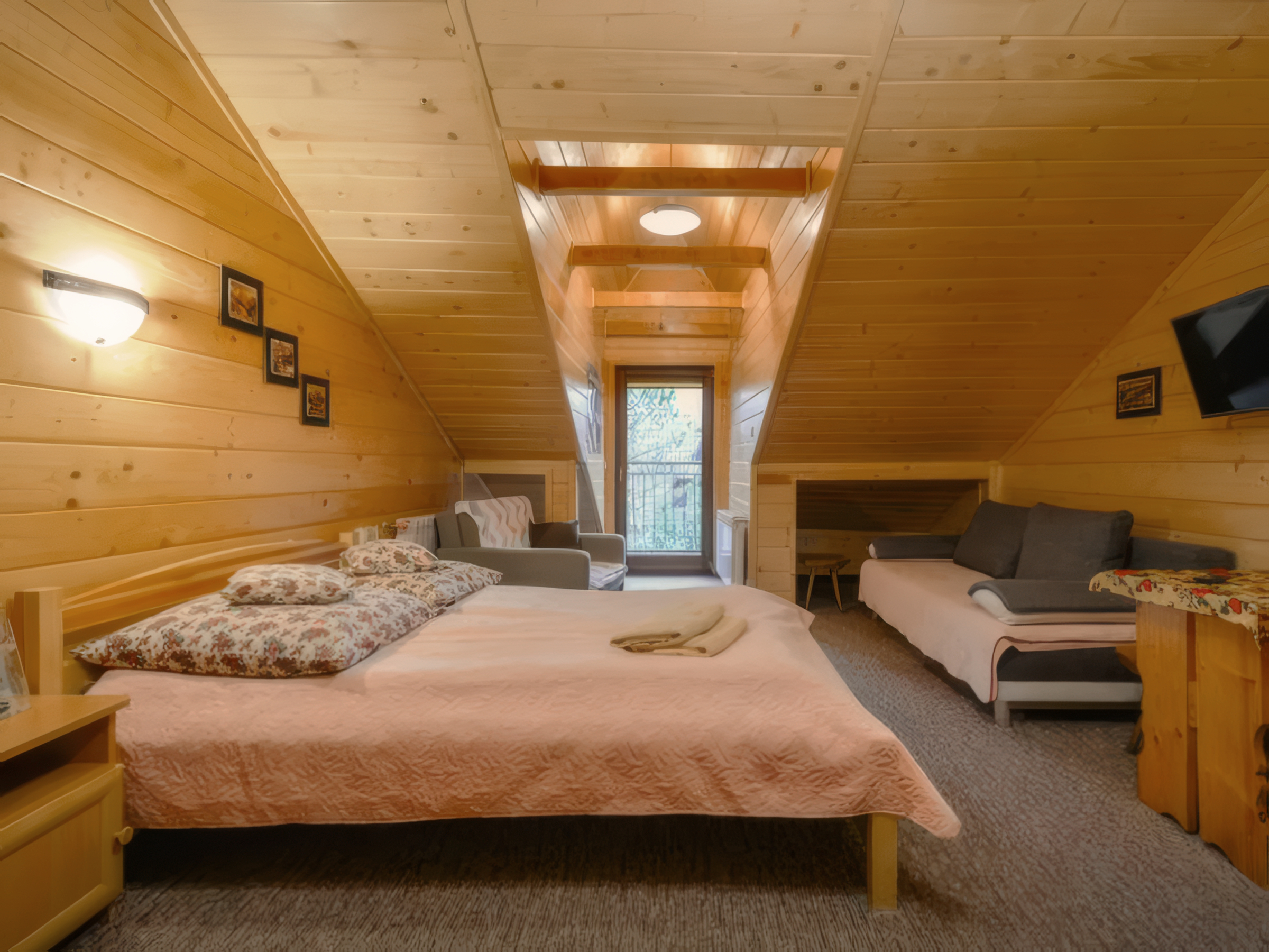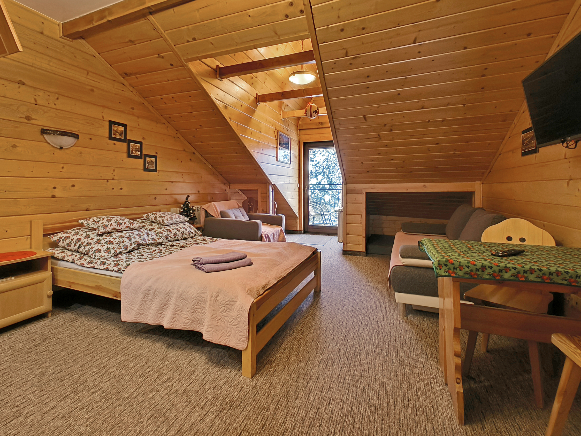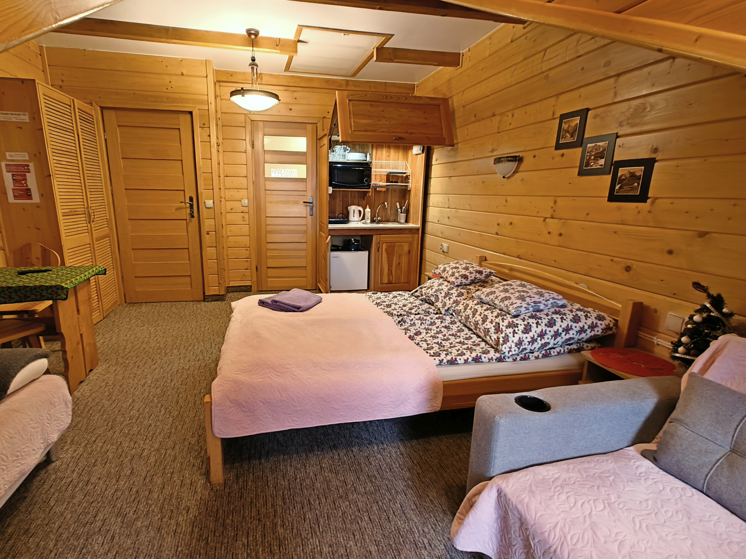 Pokój dla 2 – 4 osób na drugim piętrze, wykończony drewnem w góralskim stylu. Wyposażenie: łoże małżeńskie, rozkładana kanapa, telewizor, aneks kuchenny, łazienka, WiFi. Osobny balkon z widokiem na góry.