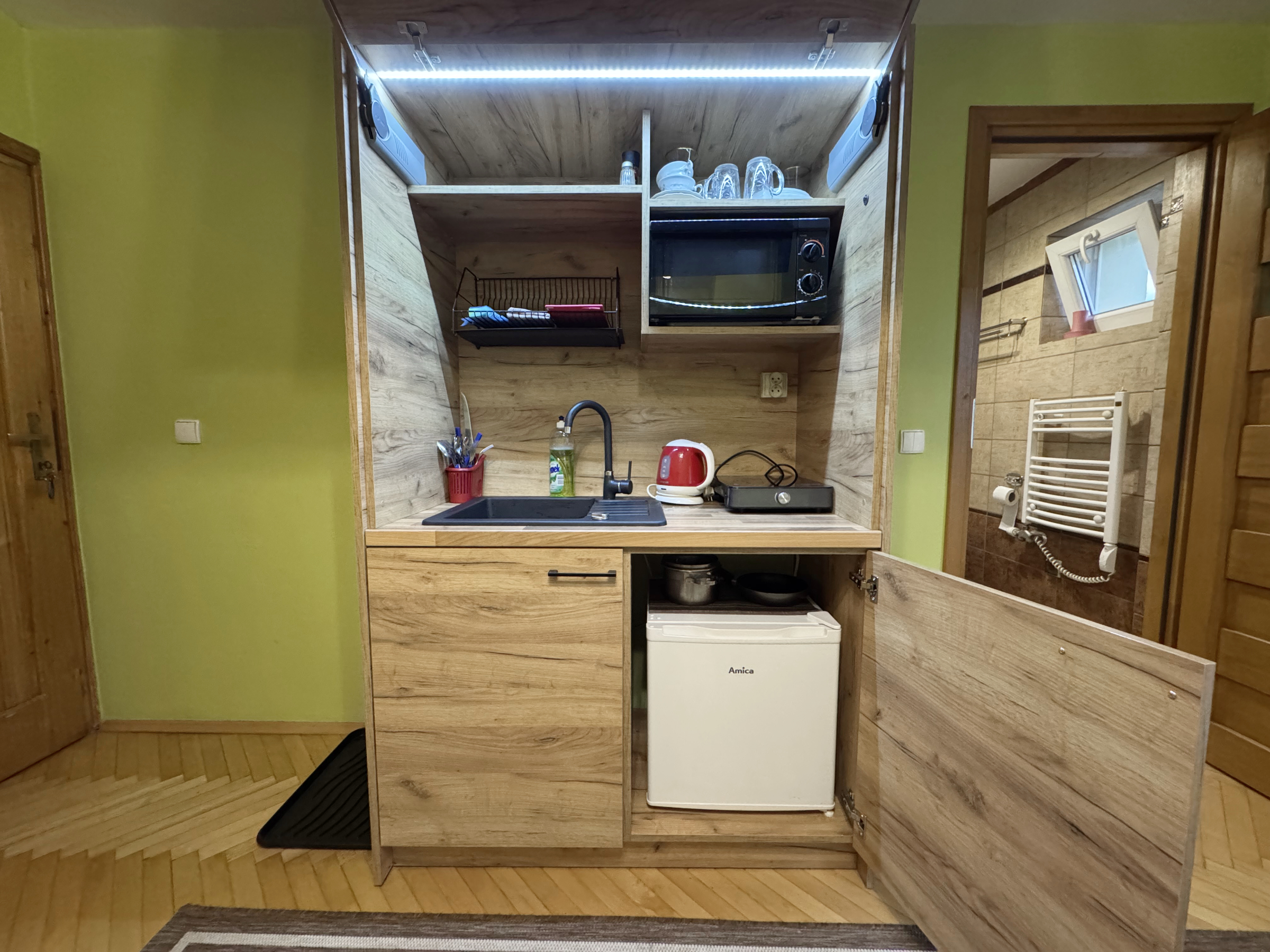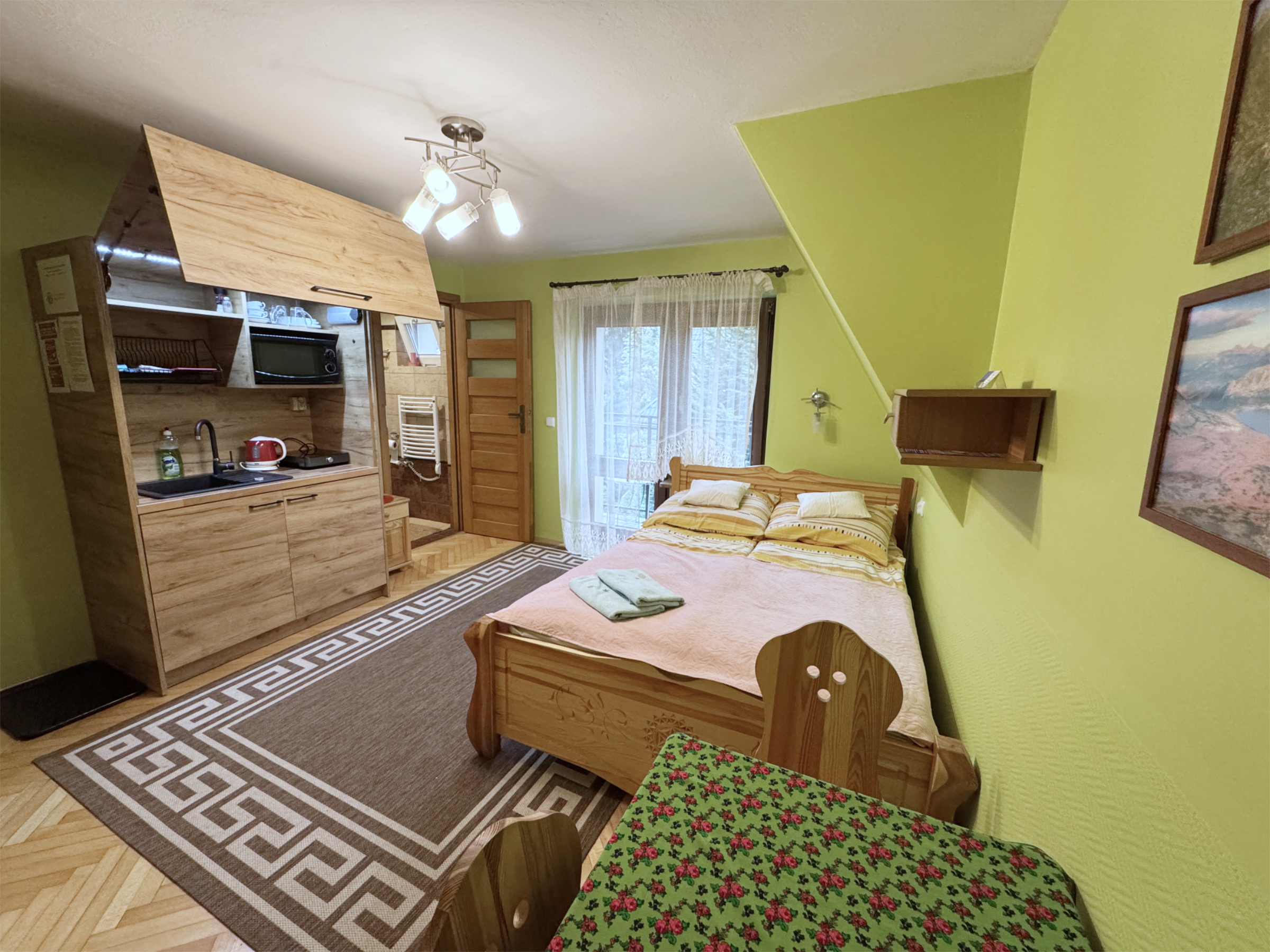 Pokój dla 2 osób na pierwszym piętrze. Wyposażenie: łoże małżeńskie, telewizor, aneks kuchenny, łazienka, balkon z widokiem na góry.